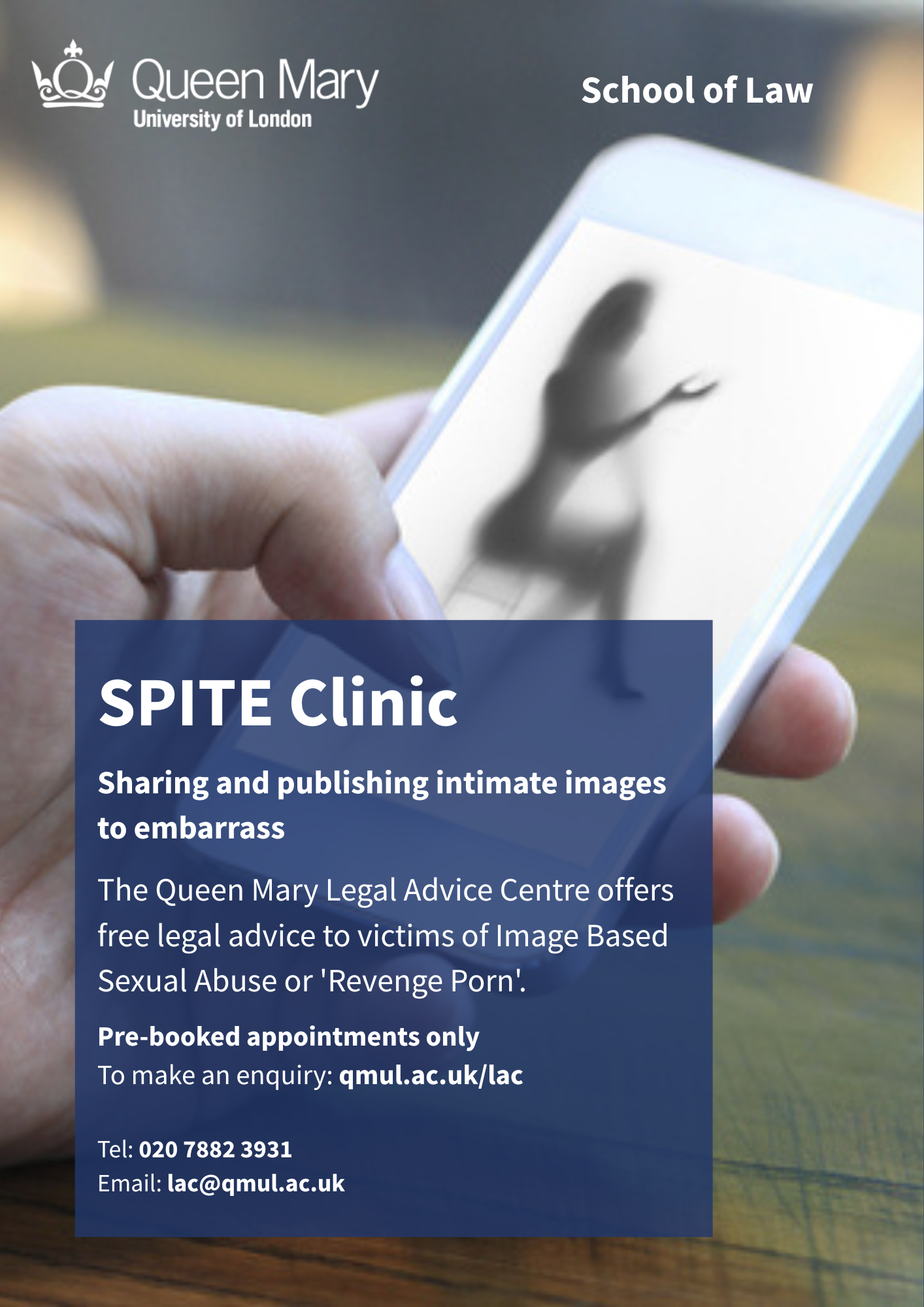 The Queen Mary Legal Advice Centre can provide legal advice to victims whose intimate images or videos have been shared, or have been threatened to be shared, without their consent.
