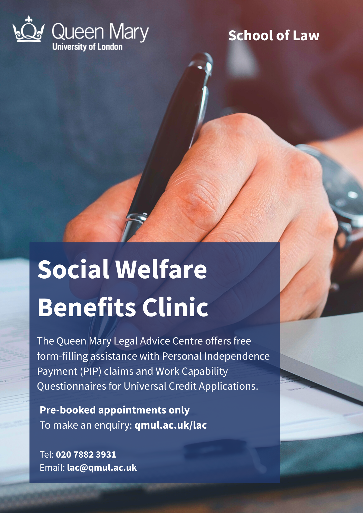 The Queen Mary Legal Advice Centre offers assistance with form filling for Personal Independence Payment (PIP) and Work Capability Questionnaires for Universal Credit (UC). We also assist with Mandatory Reconsideration requests for PIP and UC where initial applications have been rejected.