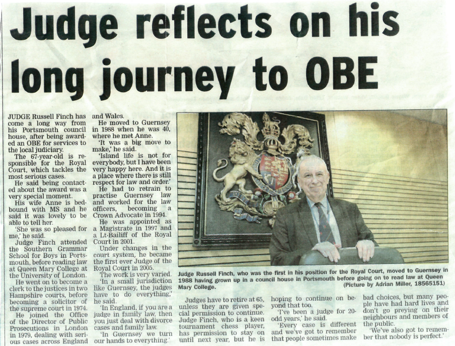 In 1988, I got a job with the Law Officers of the Crown in Guernsey. I knew the place, having spent a number of holidays there playing in the Guernsey International Chess Tournament. Initially, though the first full-time crime specialist, my work was advising and drafting. You need to re-qualify as an Advocate of the Royal Court, which involved six months at Caen University (where you were examined in five subjects by vivas, with the French students) and a Guernsey Bar exam. In those days there was also a 5-year residence requirement (now only 2). Nowadays the Caen element has been shortened and the French language aspect pruned. In 1994 I was appointed a Crown Advocate, and in 1997 the Stipendary Magistrate and Coroner. The latter, an unfamiliar task, necessitated training, as there are full-timers in England, but not enough work for one in Guernsey. Advocates robed as English Junior Barristers but had a French toque instead of a wig. The Common Law of Guernsey is based on an ancient custom of Normandy. I was the only full-timer (now we have two) and not only did crime, but civil actions and family cases. In 2005 a new post: Judge pf the Royal Court, was created and I was appointed. It is closely linked to the English Circuit Judge position. My work-load expanded to trials on indictment (drugs, which are more expensive in an Island, sex cases, serious assaults, plus all sorts of civil cases and divorce – normally dealing with the matrimonial property and custody of children). In 2020, having reached the age of 70, I retired, but was immediately sworn-in as a part-time Lieutenant Bailiff (the Chief Judge is called the Bailiff) and sit pretty regularly in all sorts of cases, including helping-out in the Magistrate’s Court.