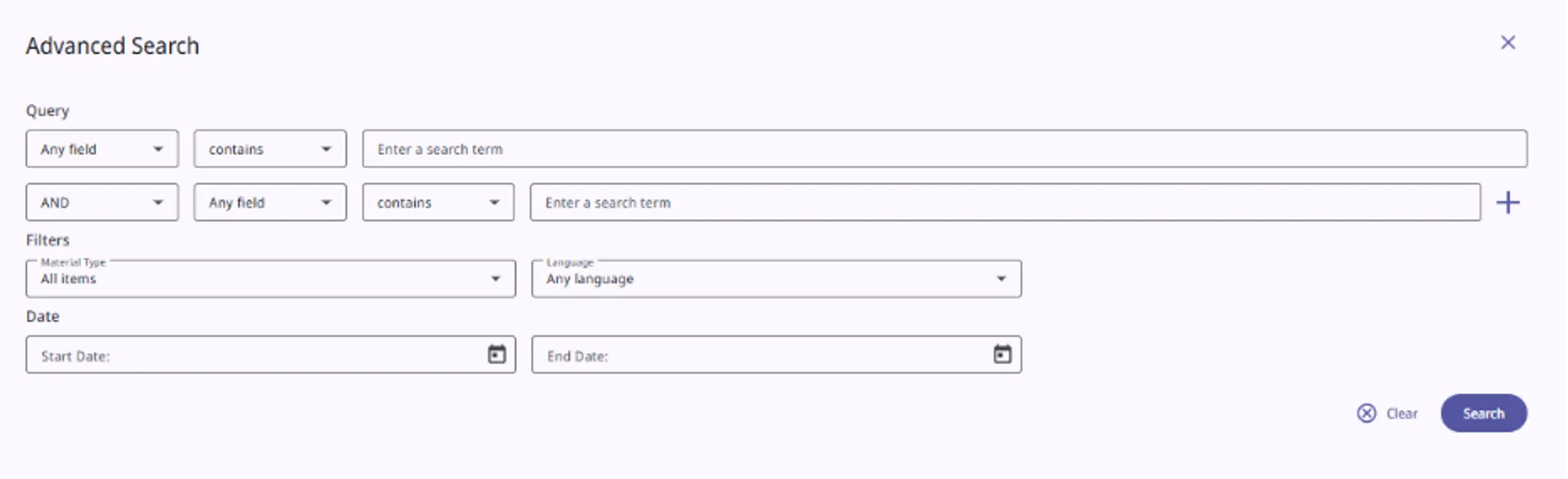 You can search by title, author, keyword, or topic in the Library Search bar. Clicking ‘Advanced Search’ gives you the ability to build a search query, or to apply filters to limit by year of publication or language, for example.