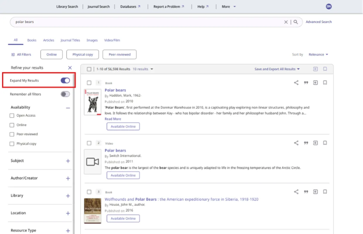 By default, Library Search will only give you results of resources we have full-text access to. If you’d like to see results for resources outside of our collections, you can click ‘Expand my Results’