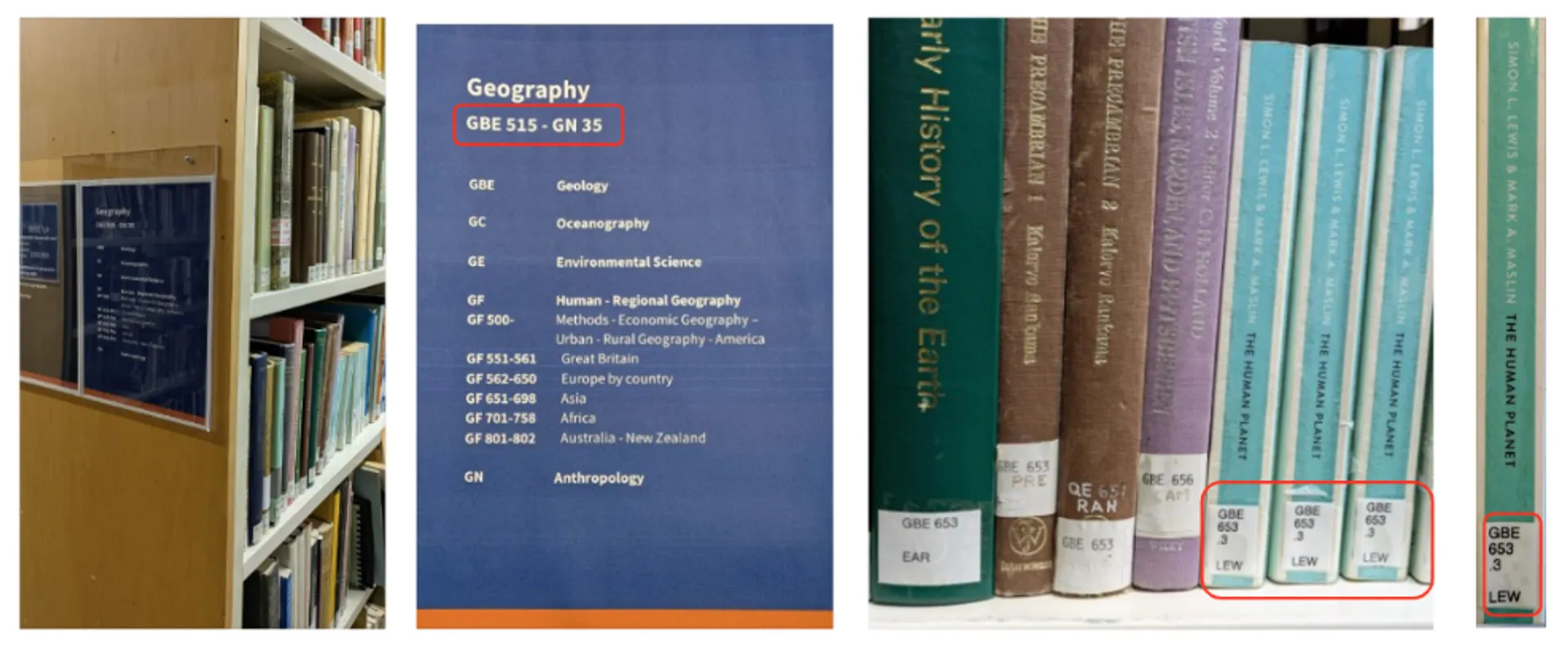 Books are arranged in alphabetical and numerical order. For example, if your shelfmark is GBE 653.3 LEW -
