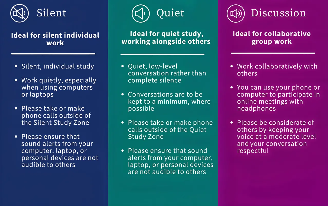 You can select from our three study zones: silent, quiet and discussion. Find the zone that works best for you: