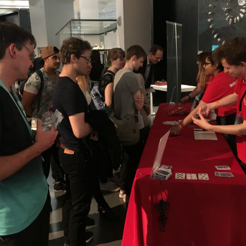 QMUL Maths students Ben Smith, Alice Stokes and Vidya Putcha spoke with over 350 guests, demonstrating the maths behind magic tricks and challenging visitors to take on Dr Nim, a marble-powered plastic computer from the 1960s.
