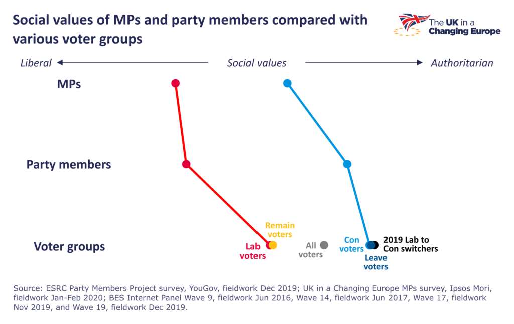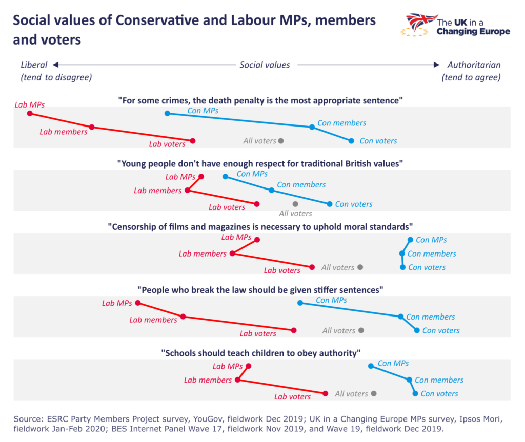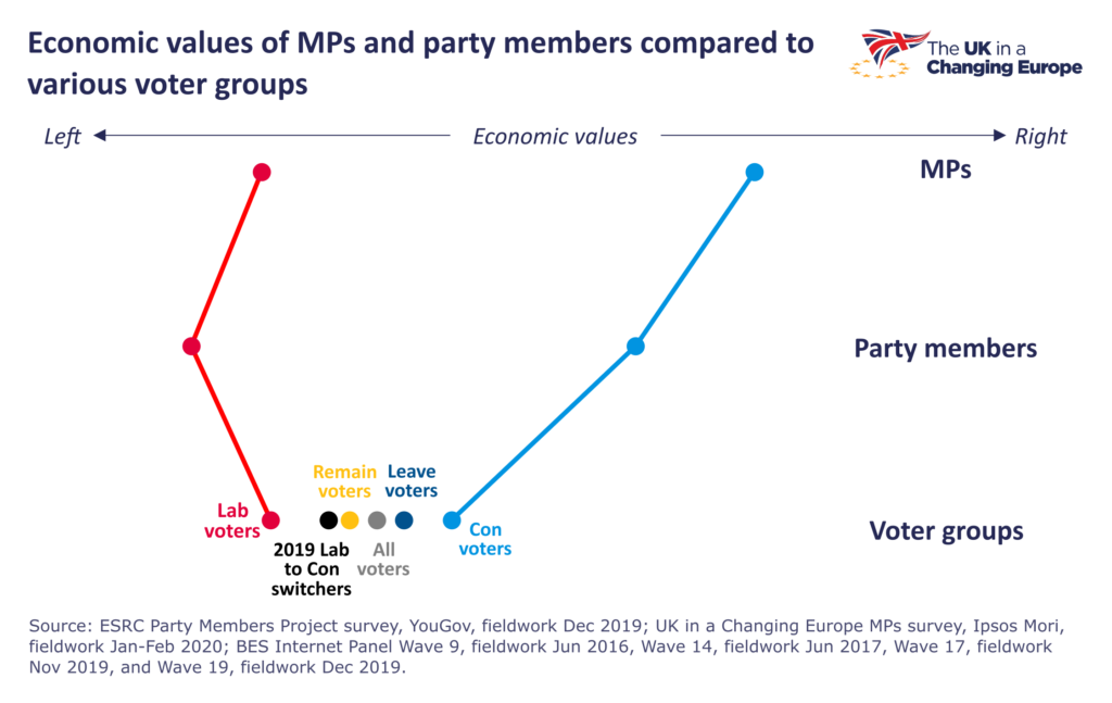 That’s because, when it comes to economic values, the Conservatives a) are less likely to see eye-to-eye with one another than their Labour counterparts and b) are further away, if not from the average voter, then from the voters that helped them win so comfortably in 2019.