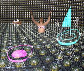 Invisible to high-energy detectors like the Large Hadron Collider at CERN, scientists search for neutrinos using highly specialised low-energy detectors like the Super K neutrino observatory. As neutrino particles interact in the Super K detector, they produce electrons, muons and other tiny particles travelling faster than the local speed of light; it is these particles that produce the "sonic boom", and it is this science which inspires Super K Sonic Booooum.