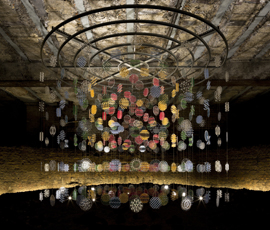 Created from 1 km of brass rods, 28,000 glass beads, hundreds of acrylic discs and 36,000 diamantes, ‘Covariance’ is suspended in a circular brick space – about 30 feet in diameter – underneath the museum.