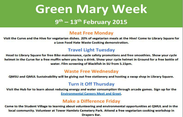 All events are open to staff and students and a summary of each day is listed below while a detailed timetable can be found here www.qmul.ac.uk/about/sustainability
