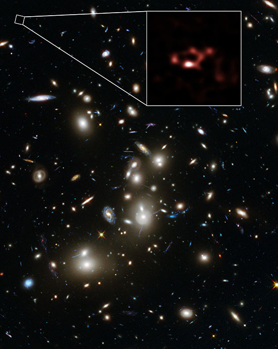 This NASA/ESA Hubble Space Telescope image shows a spectacular view of the rich galaxy cluster Abell 2744. Far beyond this cluster, and seen when the Universe was only about 600 million years old, is a very faint galaxy called A2744_YD4. QMUL astronomer Dr David Quenard was part of a team that used ALMA to make new observations of this galaxy, shown in the inset, that have demonstrated that it is rich in dust.