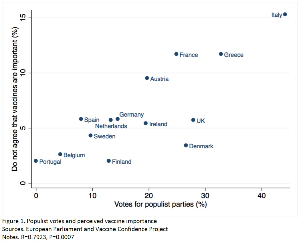 The analysis found a highly significant positive association between the percentage of people in a country who voted for populist parties and the percentage who believe that vaccines are not important and not effective.