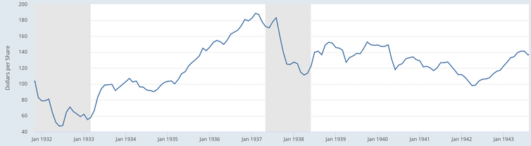 One thing we can say is that even during major armed conflicts, financial markets have often operated relatively smoothly. A clear example is the second world war. Most people would probably think there would have been a sharp dive in the stock market in September 1939 with the invasion of Poland, or after the bombing of Pearl Harbor in December 1941. Yet as you can see from the following chart of the Dow Jones Industrial Average, that is not what happened.