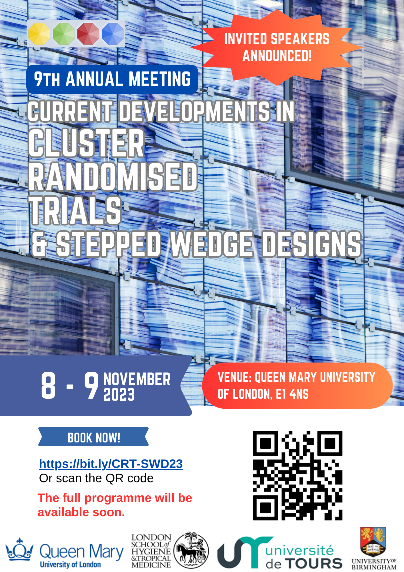 BOOK NOW! The 9th Annual Meeting on Current Developments in Cluster Randomised Trials and Stepped Wedge Designs will be taking place on Wednesday 8 and Thursday 9 November 2023. in Queen Mary, University of London, Mile End E1 4NS. The event can also be joined online. Book now via the Eventbrite page or view the full programme.