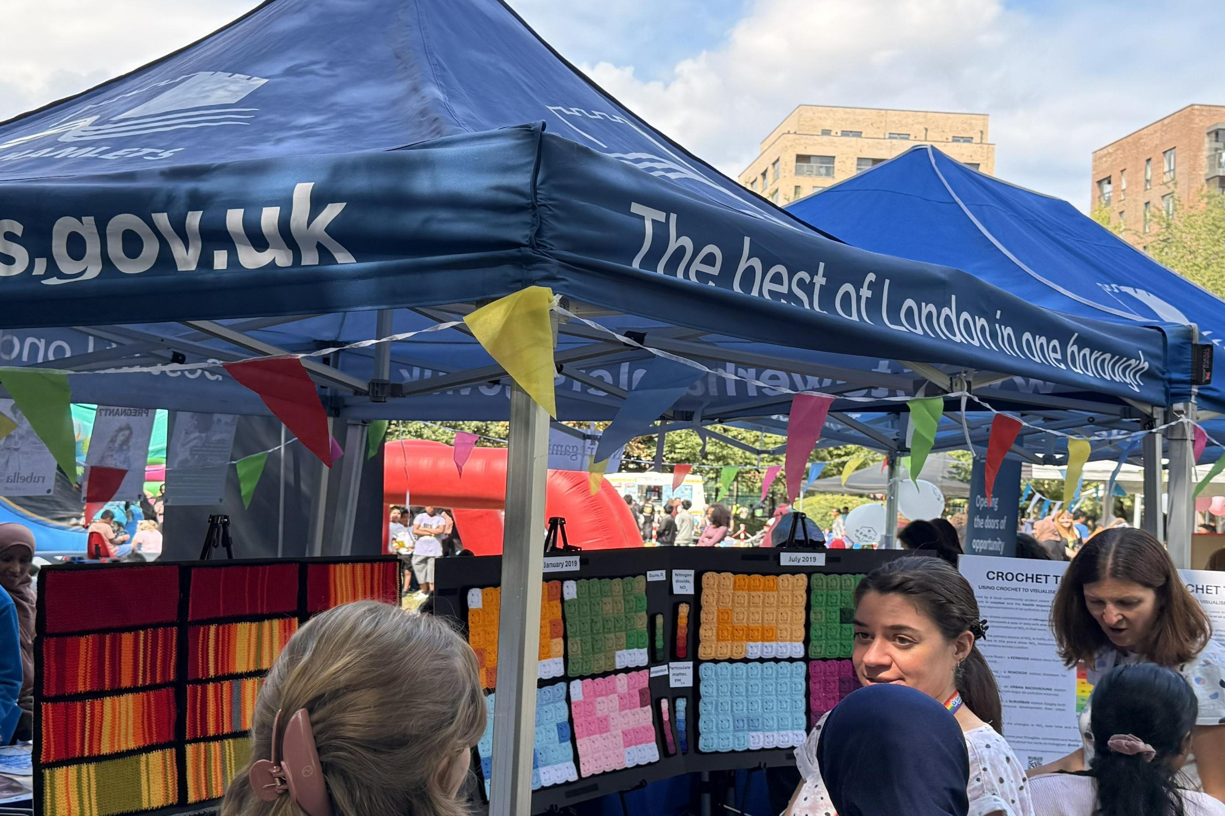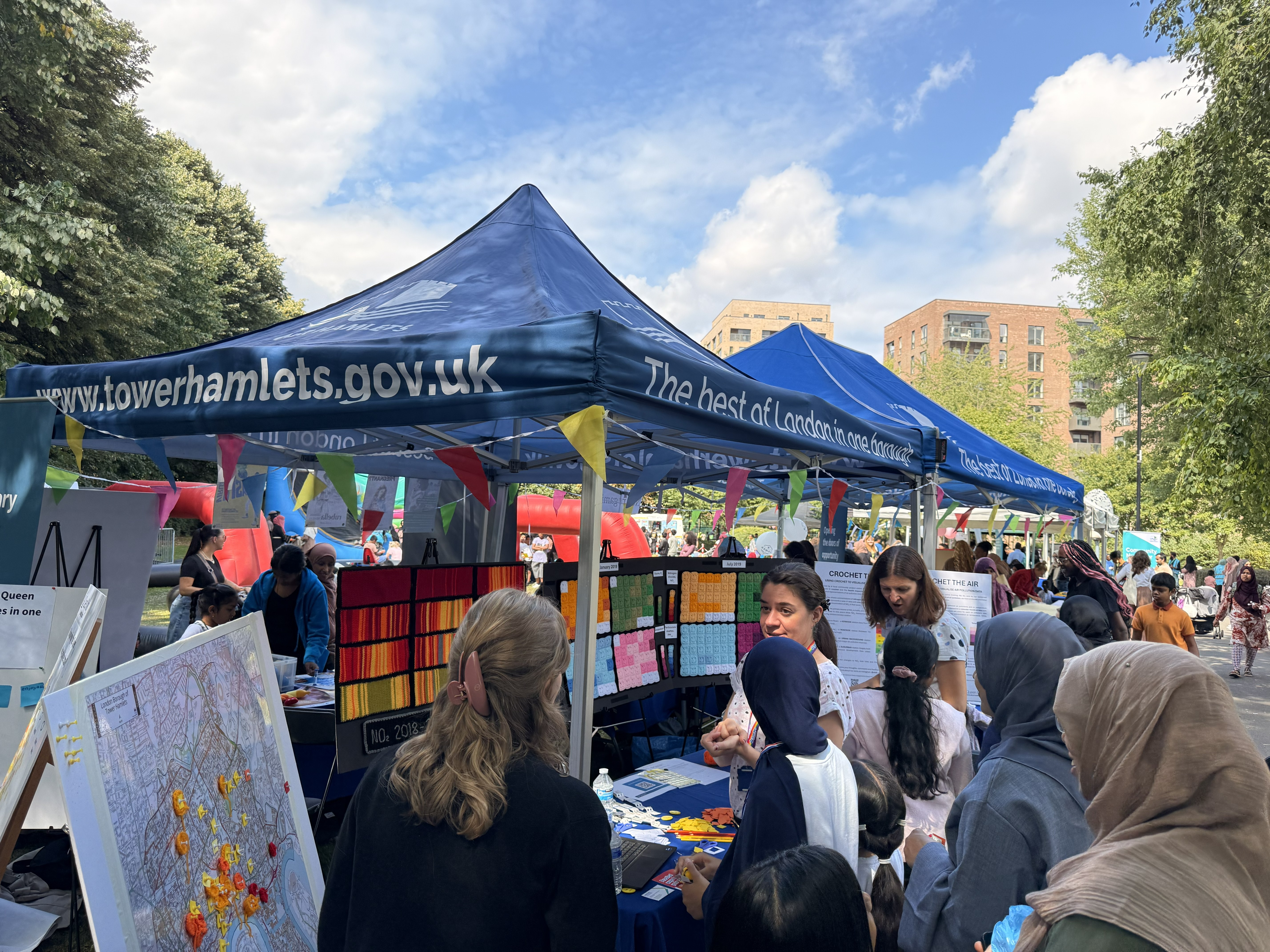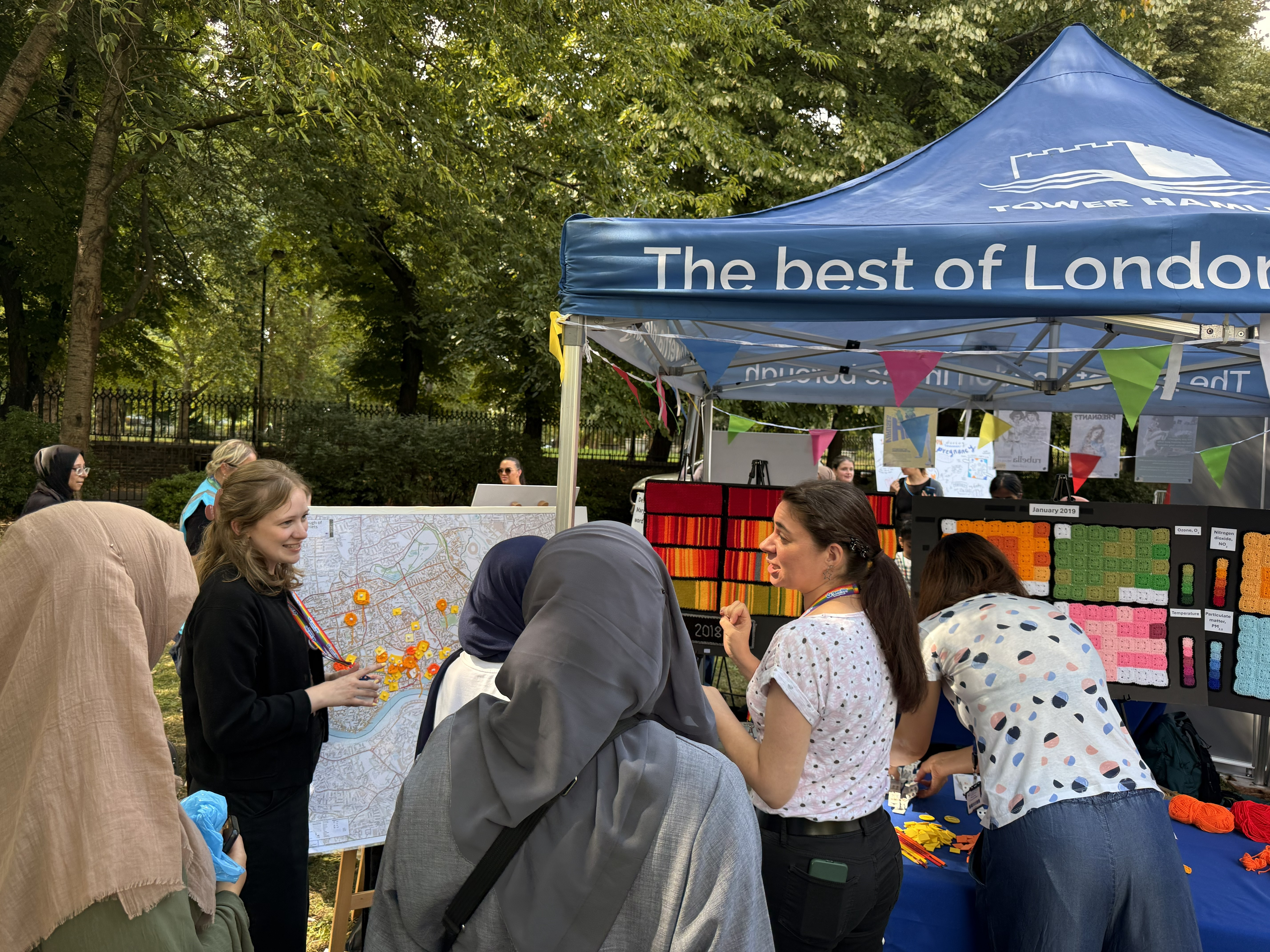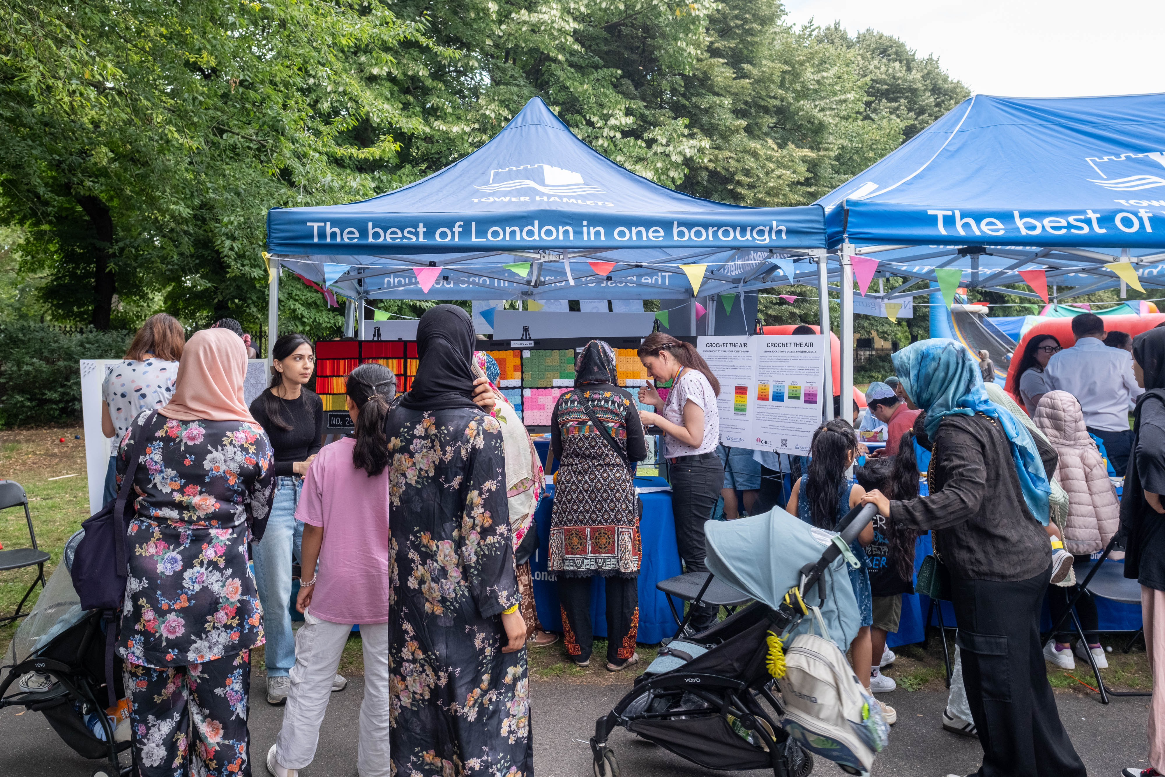 For the Tower Hamlets Family Hub Fun Day, we tailored our stand to the local area by including an interactive activity. We brought a large, laminated map of Tower Hamlets and invited people to use an online resource to look up the air quality at their residential postcode and pin a crocheted or paper square on the map to build up a picture of air quality in their local area. We talked with both children and adults at this event and discussed things like where pollution comes from, how they choose to travel, car use, public transport options, and choosing walking routes to avoid pollution. This event attracts around 1000 visitors, who were mostly local to Tower Hamlets.