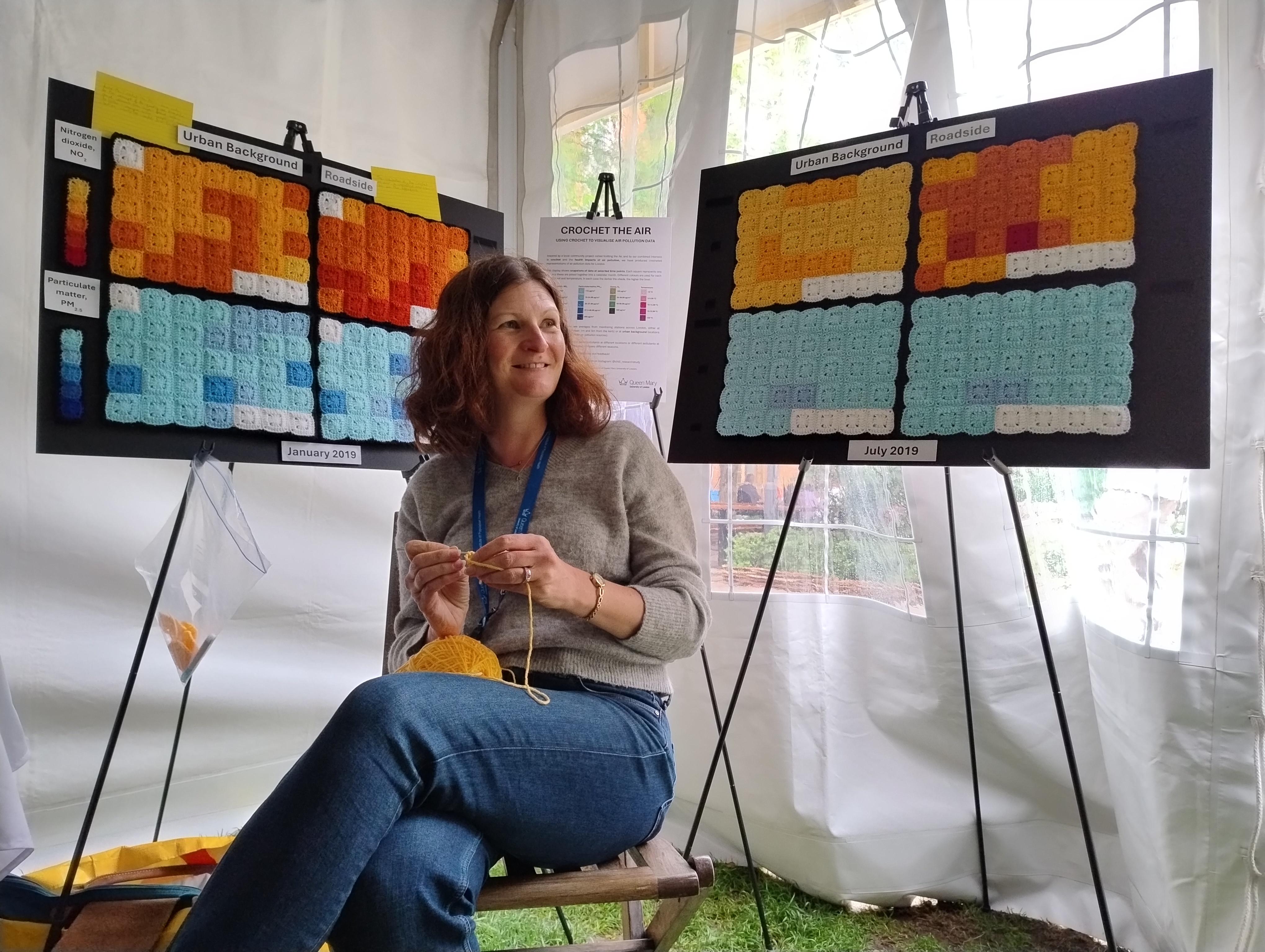 The Great Exhibition Road Festival event took place in South Kensington and focused on both science and the arts. Our crochet work was displayed as part of a stall called “Cleaning the air: do clean air zones work?”. Approximately 200 people visited the stall over the two days of the event. The stall was in an adults-only area of the festival, and we interacted with people from a wide geographical area – from London, elsewhere in the UK and from overseas. Conversations focused on topics such as the impact of the London Ultra Low Emission Zone (ULEZ), different types of air pollutants and sources and how these are affected by location, season, weather etc.