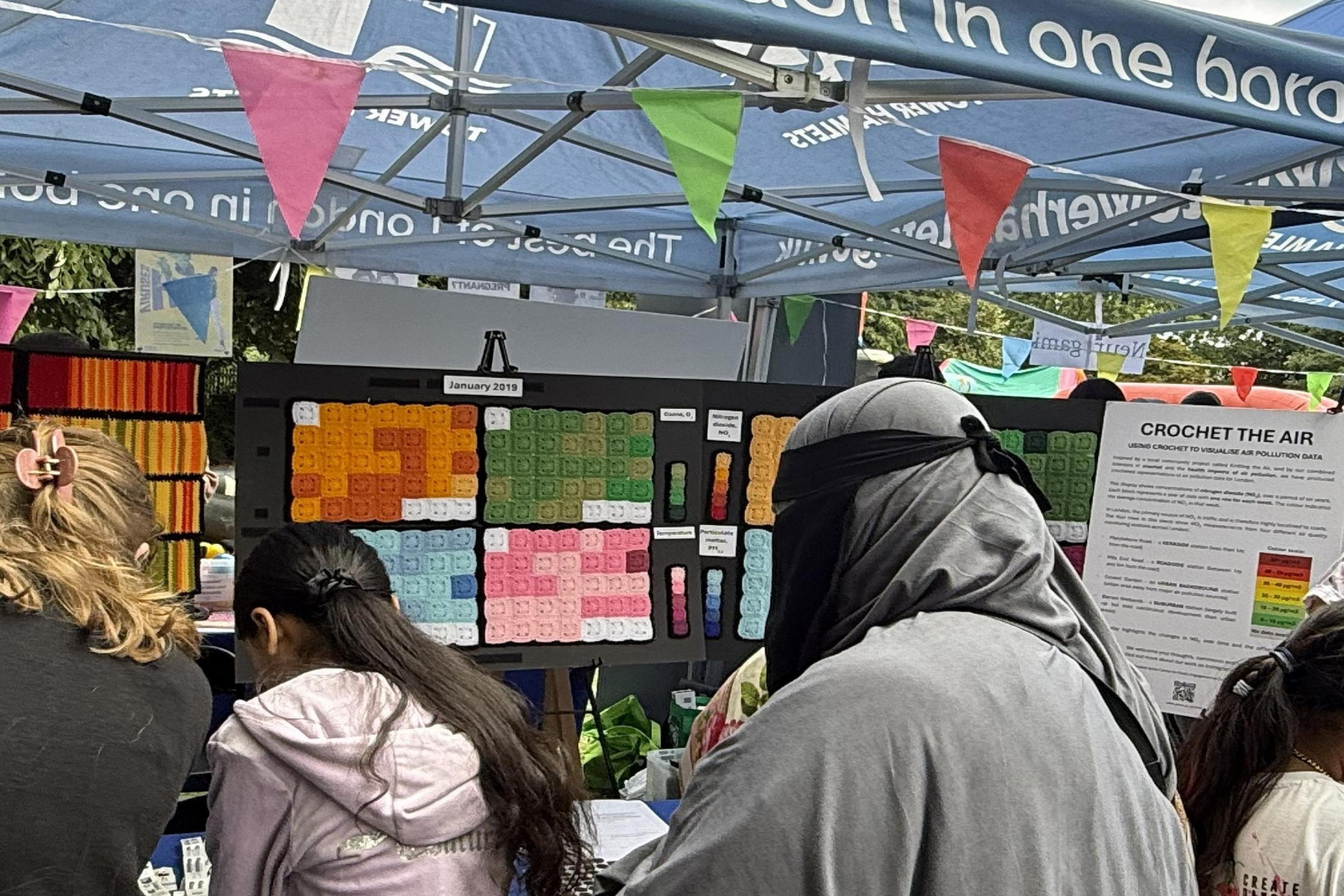 As part of our activity at the Tower Hamlets Family Hub Fun Day we introduced the activity where people could look up the air pollution exposure at their home postcode and add this information to a map of Tower Hamlets. This worked well and created an opportunity for people to get hands-on with building a personalized image to inspire reflection on the air quality in their local area. We would like to develop this activity for future events and have more interactive activities alongside the crocheted pieces.