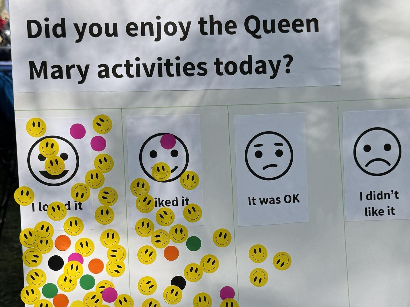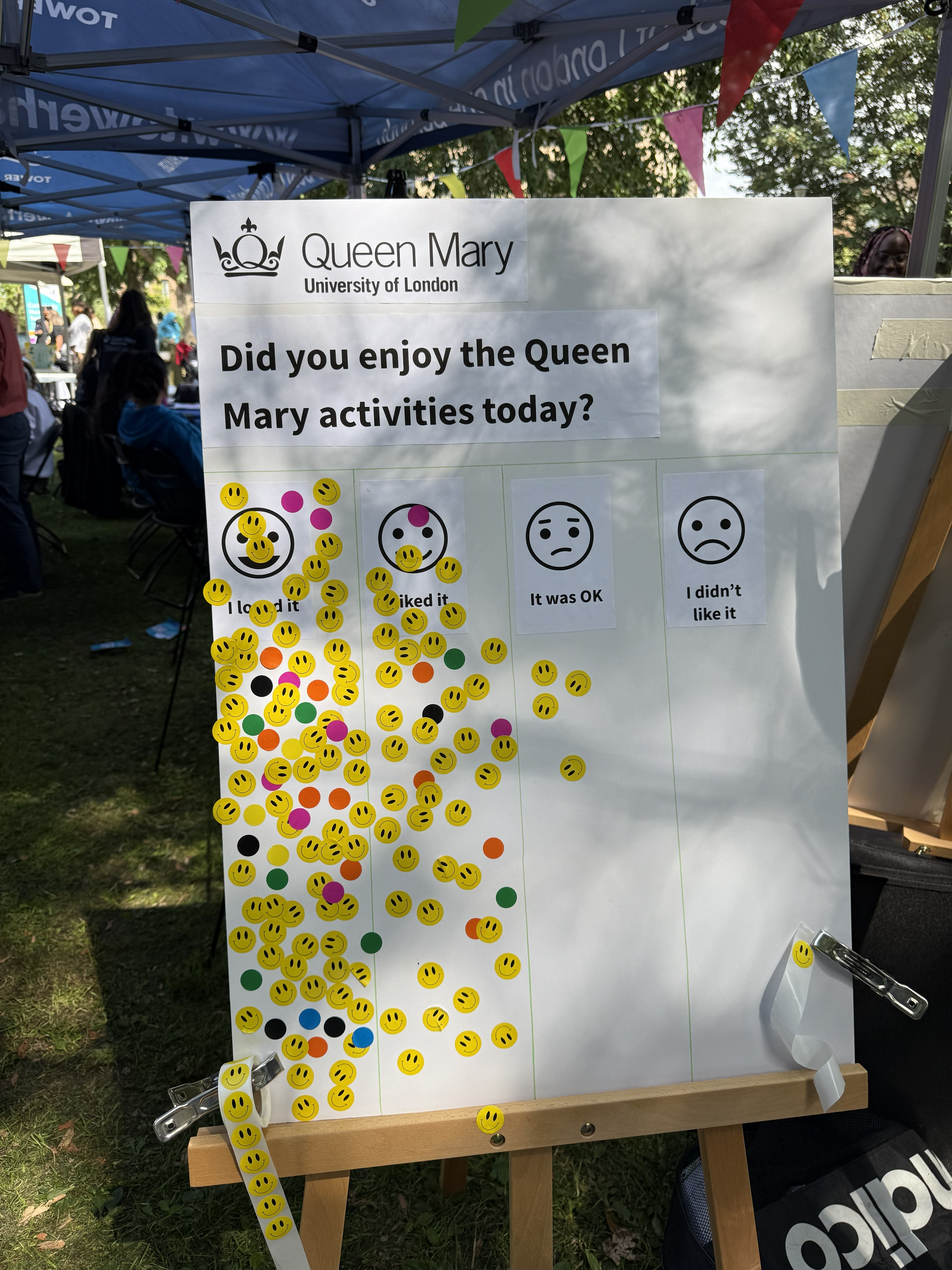 This was not a hugely successful aspect of the project, as not many people gave feedback in this way. We had some positive comments back from the Great Exhibition Road Festival, which was in the adults-only zone, and found that sticky notes were good for this as we could stick them up on a board on the stall. But at the Family Hub Fun Day it was far too busy and hectic to engage people in this way. As part of the QMUL stand, the CPE team had asked people to rate the stand using stickers, which was a nice simple way to express their opinion. It might have been nice to ask people to record a quick ‘vox pop’ feedback on video (if they were happy to be filmed). We might try this in the future as it’s very useful for social media.