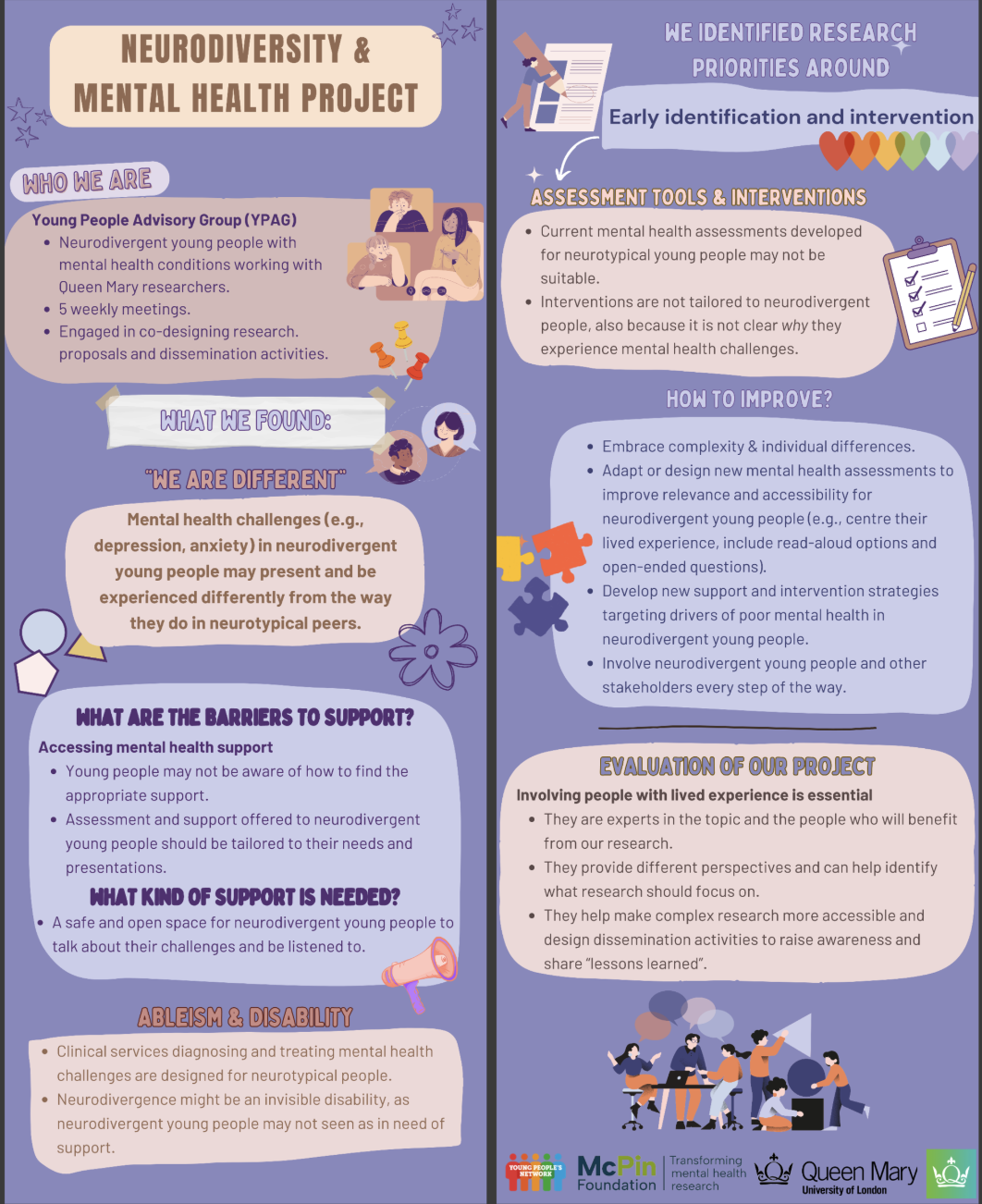 We organised five sessions with YPAG members and two additional focus groups with other stakeholders. We used multiple methods to facilitate the YPAG and focus group meetings, including Mentimeter, Padlet, and both large and small group online discussions. Our discussions focused on research priorities around improving mental health in neurodivergent people, including a better understanding of the lived experiences and presentations of mental health challenges in neurodivergent young people. We also discussed how future research should address the identified priorities, and co-designed the aims of a new funding application to support this research. Finally, we worked with YPAG members to co-design dissemination activities (e.g., a seminar for QMUL researchers) and an infographic to visually convey the insights and knowledge we gathered during the project in our dissemination activities.