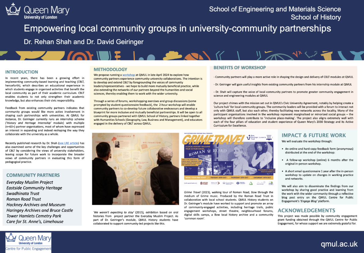 In recent years, there has been a growing effort in implementing community-based learning and teaching (CBLT, henceforth), which describes an educational experience in which students engage in organised activities that benefit the local community as part of their academic curriculum. CBLT enables students to not only strengthen their academic knowledge, but also enhances their civic responsibility. Our project came about as Dr Rehan Shah, who has conducted research into the benefits of CBLT, wanted to engage with existing CBLT programmes at QMUL, and so contacted Dr David Geiringer in the School of History. Dr. Geiringer currently runs an internship scheme (‘History and Heritage Internship’ module) at QMUL with multiple (n=60+) partner organisations. Feedback from existing community partners indicates that community groups would like more active involvement in shaping such partnerships with universities. Several partner groups have expressed an interest in expanding and indeed reshaping the way they collaborate with the university as a whole - for example, Sadiya Ahmed, Director of the Everyday Muslim Project, is eager to develop new networks and working practices to better support knowledge exchange between QMUL and the communities her organisation represents.