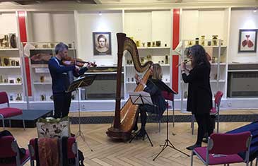 Late afternoon on a Monday in early October and my steps up the stone stairs to Barts Pathology Museum are accompanied by the ethereal sound of a harp, flute and violin. The music swells and pulses as I grow closer and I tiptoe through the doors to the sight and sound of the Harborough Collective rehearsing.