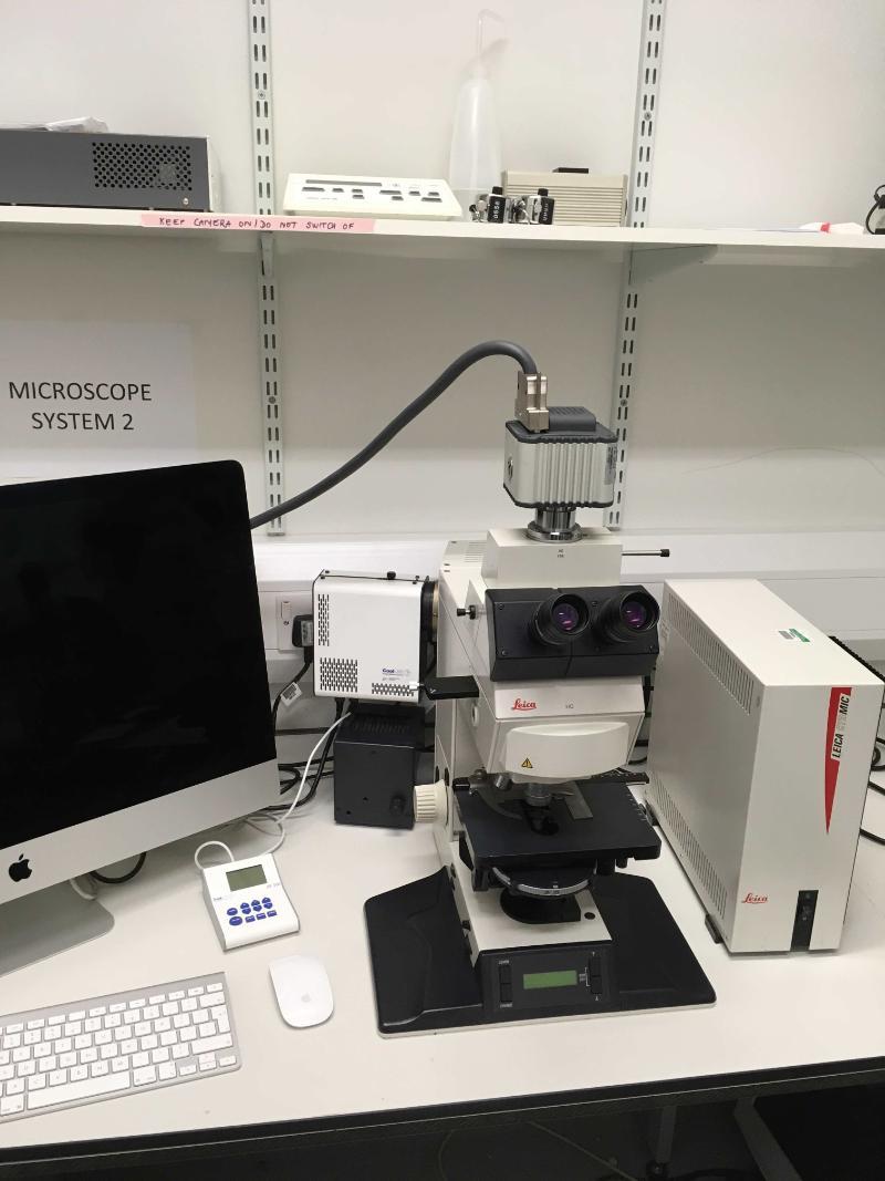 Digital camera/ upright microscope system suitable for epifluorescent microscopy.
