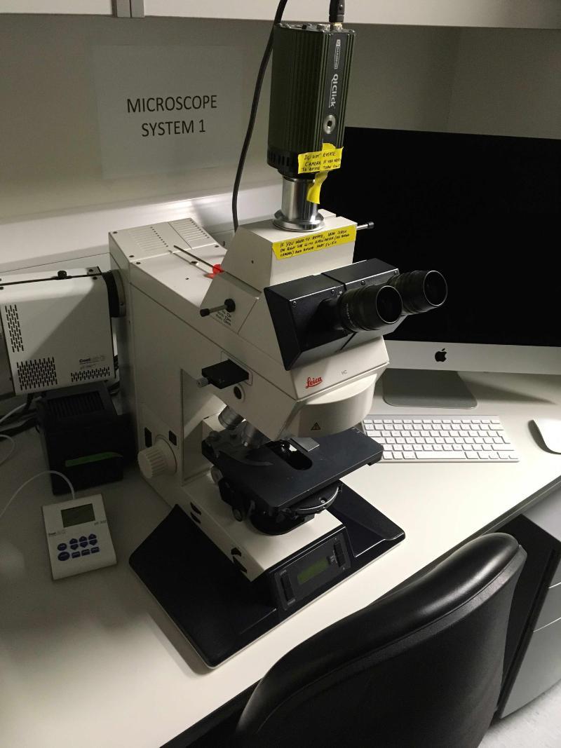 Digital colour camera/ upright microscope system suitable for bright field colour microscopy, also capable of fluorescent imaging.