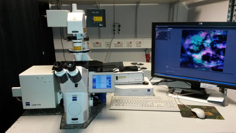 The LSM 510 confocal microscope is inverted and equipped with four lasers.