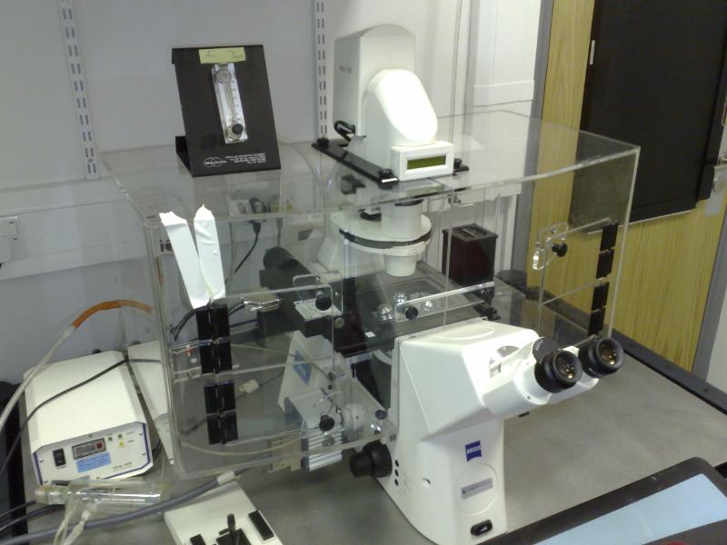 Zeiss Axiovert 200M motorised inverted microscope with scannig stage and environment chamber. Phase objectives 5X, 10x, 20x, and 40x. HBO light source with filter sets for FITC, Cy3 and Far Red. Equipped with an AxioCam MRc monochrome camera. Zeiss AxioVision software.