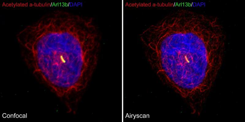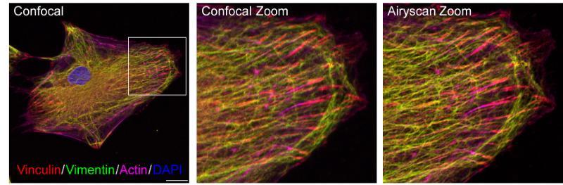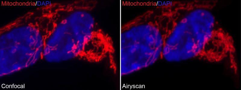 State-of-the art, fast scanning, near super-resolution confocal microscope. The Airyscan detector makes it possible to increase the resolution of your imaging far beyond the resolution of a classic confocal point scanning microscope. In addition, images can be acquired with high sensitivity and high speed.