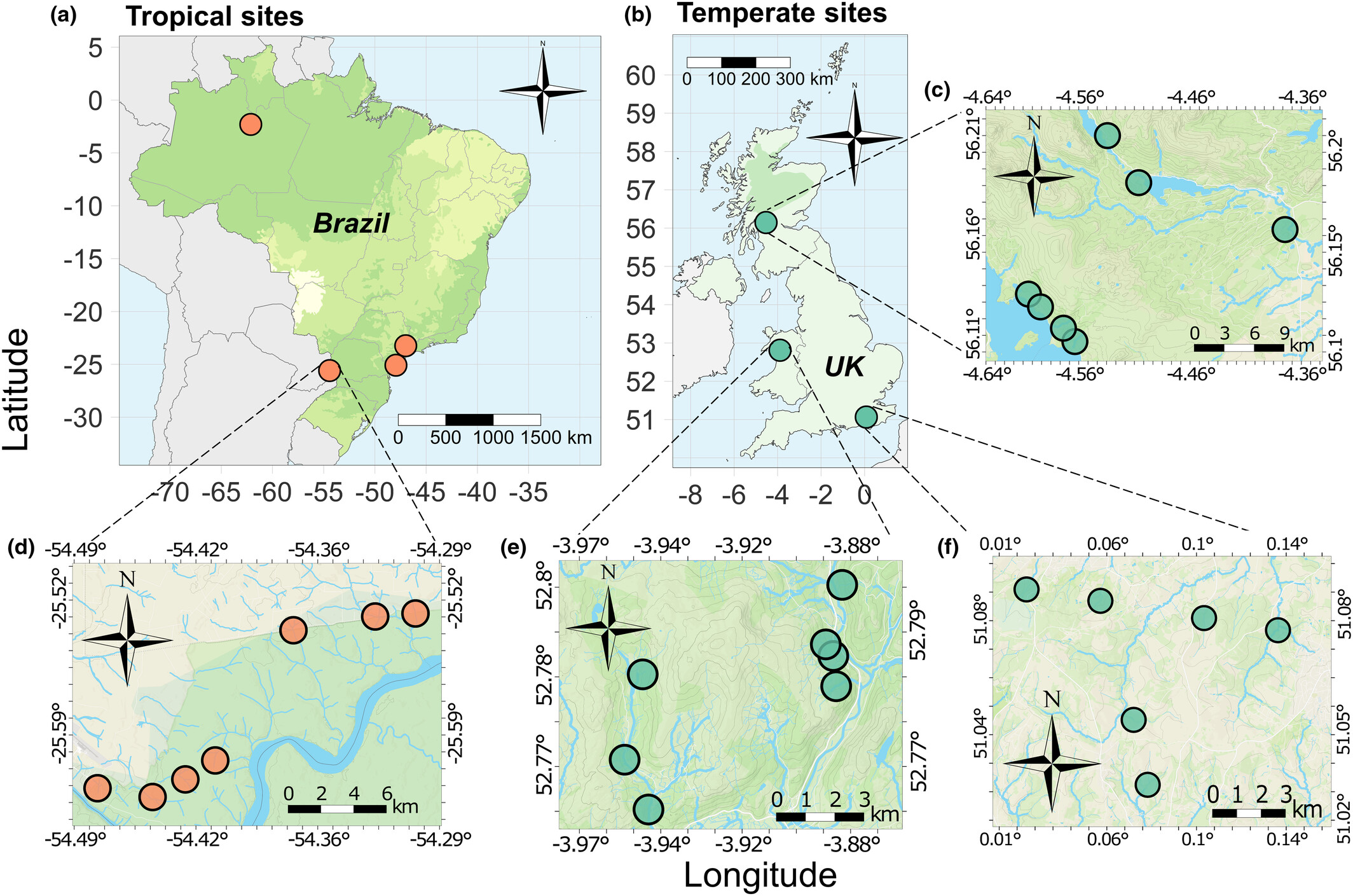 Illustration of the hierarchical, spatially nested sampling design, sampling 240 riparian arthropod communities from 48 streams in 7 sites across two ecosystem types: (a) four tropical rainforest sites in Brazil and (b) three temperate mixed broadleaf forest sites in the UK. Sampling was conducted at five distances along 150 m taken from 6 to 7 replicate streams within the same catchment at each site, e.g., (c) The Trossachs National Park, UK; (d) Iguacu National Park, Brazil; (e) Snowdonia National Park, UK; (f) Ashdown Forest, UK. Country maps coloured by ecoregion classification from Olson et al. (2001). Site maps were made using ArcGIS® software with the ‘Outdoor’ base-map by Esri©.