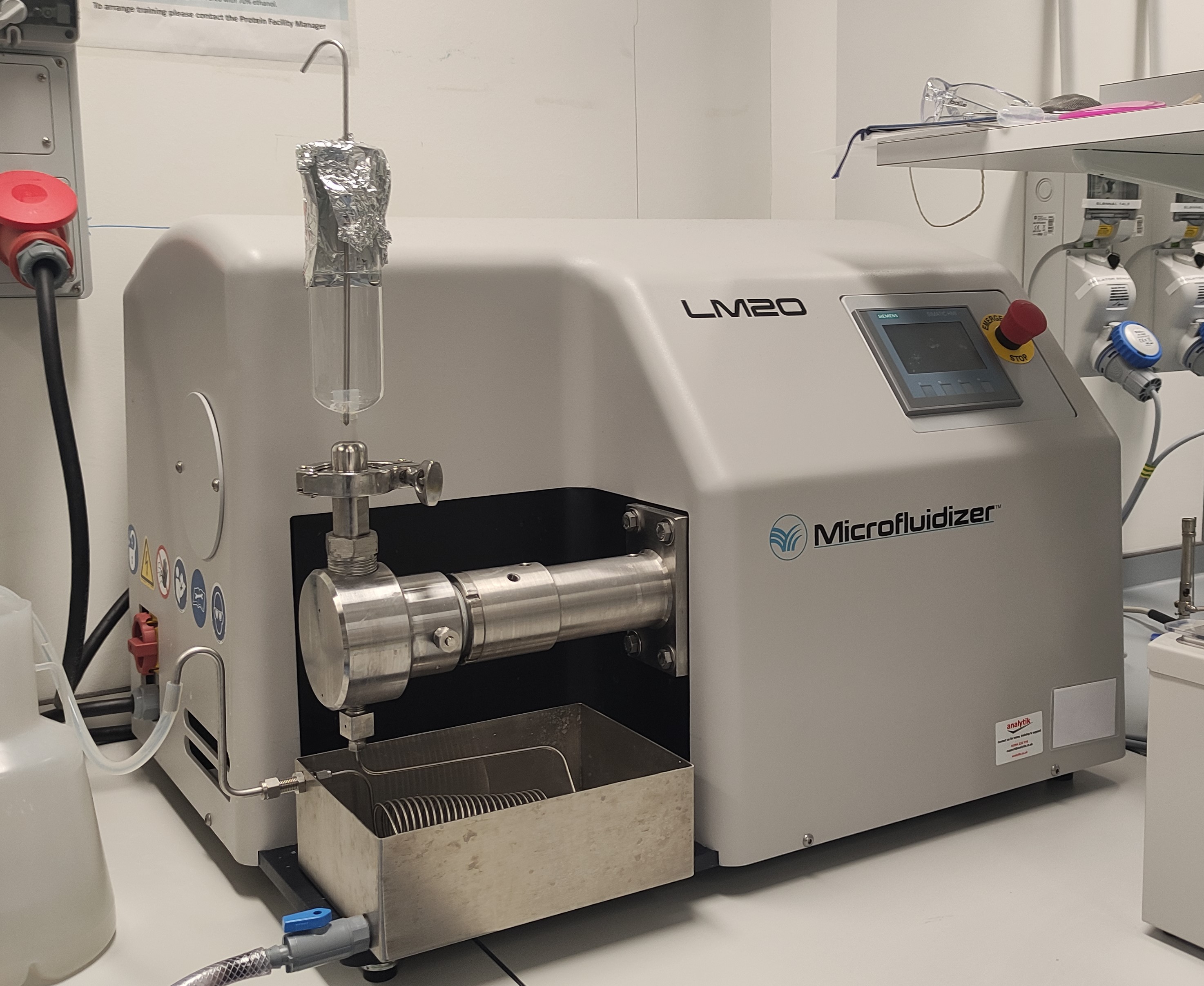 Sonicator, for smaller scale purifications of 10-100 ml of resuspended bacterial cells and for larger preps: the LM20 Microfluidizer, which can process upwards from 100 ml. The LM20 can operate at pressures up to 30 000 psi, to efficiently lyse bacteria and yeast. The cooling coil keeps the sample protected from heat damage and the lysis is consistent and reproducible.