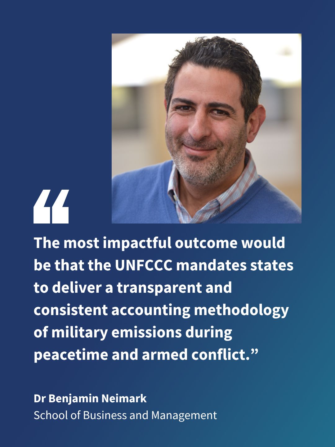 Dr Ben Neimark, Reader in Geopolitical Ecology at the School of Business and Management, is leading Queen Mary’s COP30 side event this year. Entitled “Monitoring and Addressing Climate Impacts Across the Conflict Cycle,” the event will take place on 14 November in the Blue Zone in collaboration with partner organisations from Sweden, Colombia, Slovenia, Ukraine and the UK. The session will show how each stage of war, from build-up to recovery, adds emissions and environmental harm, and will outline practical ways to reduce or eliminate these negative impacts.
