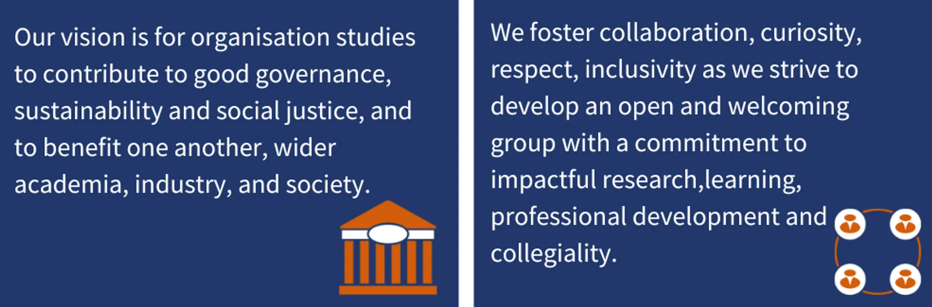 Our mission is to nurture and grow a welcoming, interdisciplinary and collaborative community which enables researchers to thrive. To empower group members – who research organisations, organising, and the organised – to extend their research impact, access meaningful feedback, secure joint funding, build their networks and partner with academics in and beyond QMUL, industry professionals and policy makers.