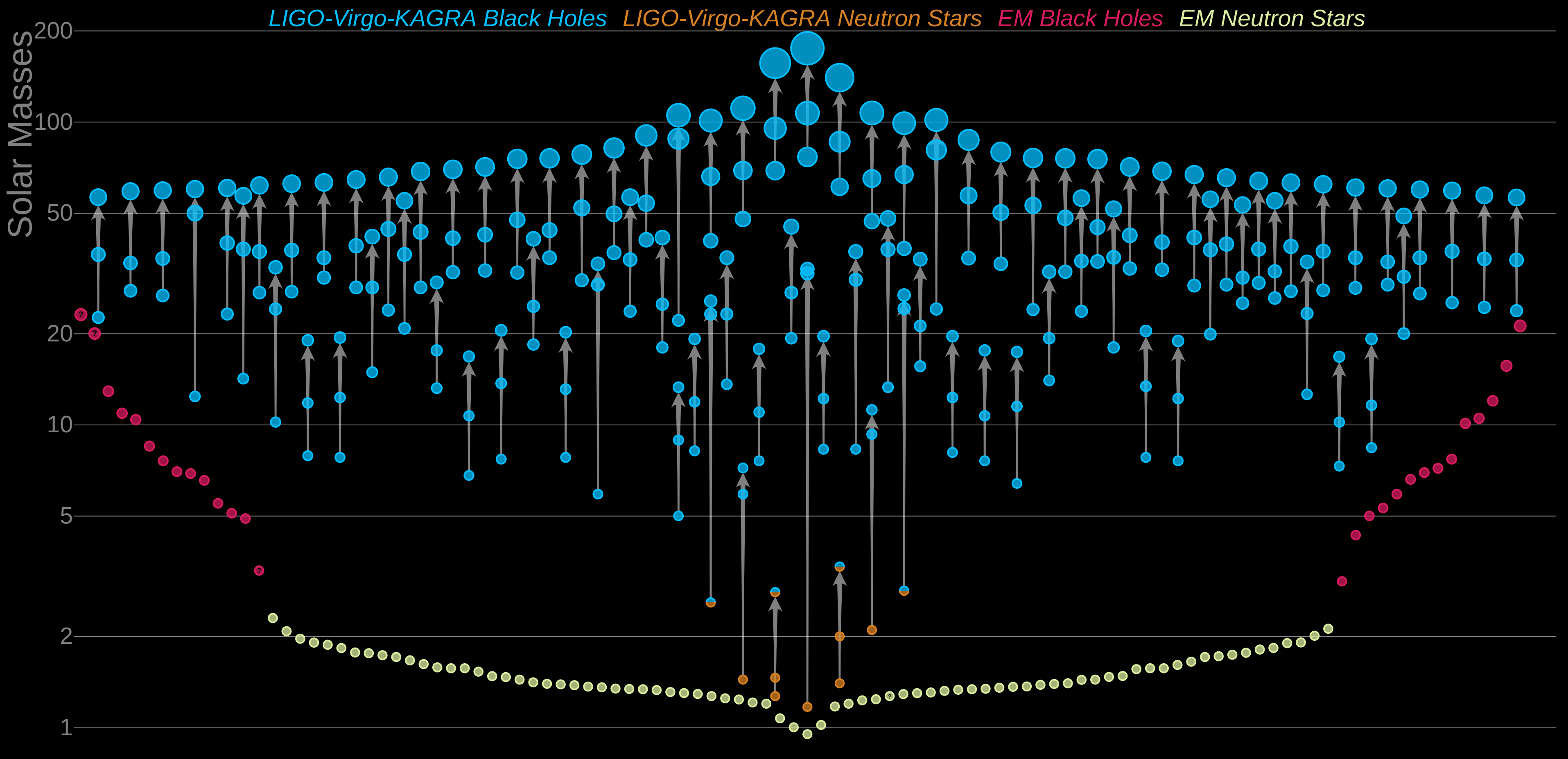 Distribution of LIGO-Virgo-KAGRA black holes and neutron star masses together with the black holes and neutron stars observed electromagnetically.