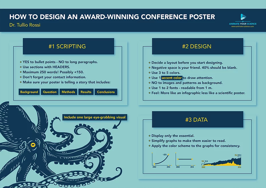 The primary purpose of a poster is not to communicate every little detail of your research, but to attract people’s attention and serve as a conversation starter. A poster should use visuals to draw people in from a distance. Then, as people step closer and begin reading it, the words along with the visuals will start to communicate the background to your work, why you've done it, and what it means.