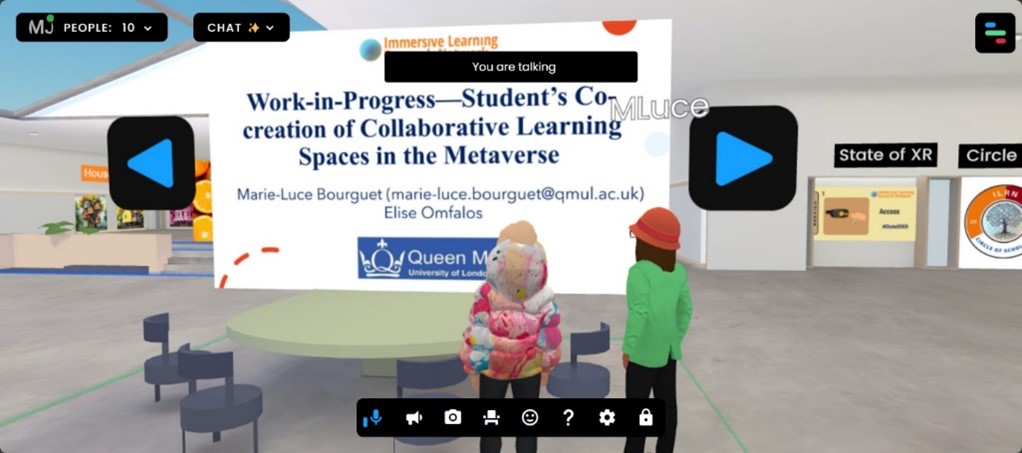 A notable feature was the use of audio zones, where you could only hear people within an outlined area, making it easy to wander between posters and drop in on discussions around the room. In this screenshot, Megan is with Queen Mary University academic Marie-Luce, who was presenting her research on collaborative learning in the metaverse.