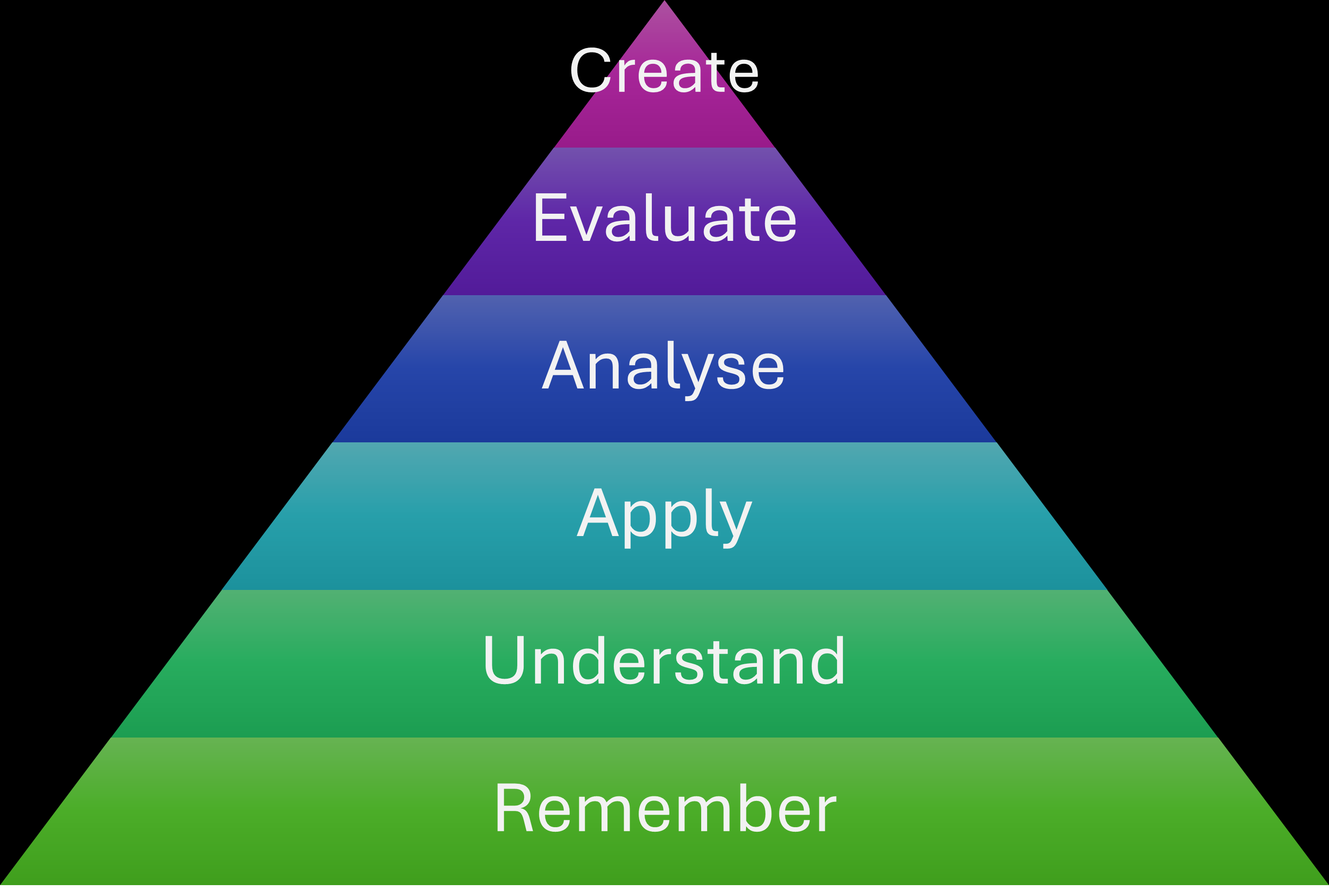 As most of you will know, Bloom's Taxonomy is a framework that helps us understand the levels of thinking involved in learning. It is often shown as a pyramid, with basic thinking skills at the bottom, and more complex ones at the top. The idea is that deep learning happens when you move up the pyramid - you're not just memorising facts, but understanding, applying, and creating new ideas.