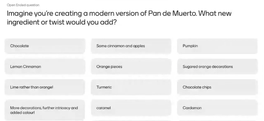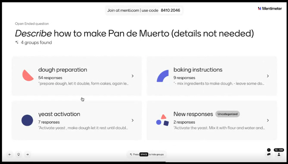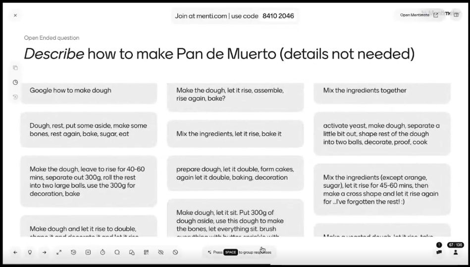 Then we had an open-ended question asking us to 'describe' (understand) how to make Pan de Muerto. A nice feature of Mentimeter allows you to group open-ended question responses together, and this functionality was used live in the webinar.