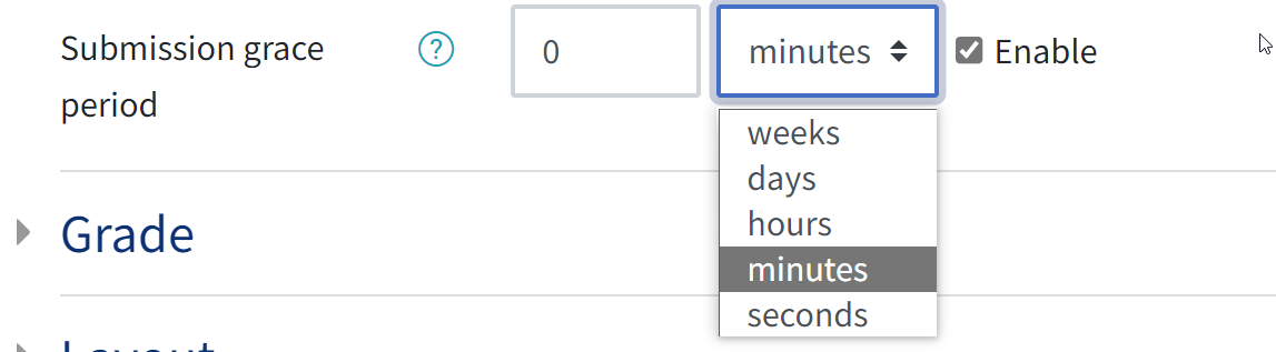 This option gives the students a bit more time after the quiz time has expired to submit. Quiz creators can confirm how long the grace period is they wish to have. To do this they simply scroll down to the "Submission grace period" setting and tick "Enable". There is a wide range of durations available, from seconds up to weeks.
