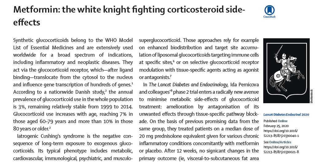 Pernicova, I., Kelly, S., Ajodha, S., Sahdev, A., Bestwick, J.P., Gabrovska, P., Akanle, O., Ajjan, R., Kola, B., Stadler, M., Fraser, W., Christ-Crain, M., Grossman, A.B., Pitzalis, C. & Korbonits, M. Metformin to reduce metabolic complications and inflammation in patients on systemic glucocorticoid therapy: a randomised, double-blind, placebo-controlled, proof-of-concept, phase 2 trial. Lancet Diabetes and Endocrinology 2020; 8: 278-291. ^10.1016/S2213-8587(20)30021-8