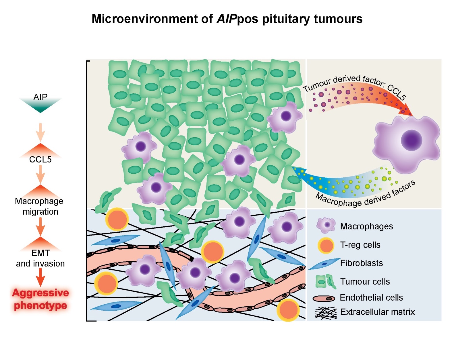 Crosstalk between AIPpos tumours and the tumour microenvironment. AIPpos tumours have EMT signatures and increased immune cell contents, cytokines and abundant vascular structures which create a tumour supportive microenvironment to promote aggressive tumour growth. The upregulation of the CCL5 in the AIPpos tumours and the in vitro data presented suggest that CCL5, secreted by the tumour cells, may contribute to the recruitment of macrophages and initiate bidirectional paracrine signalling loops which facilitate increased migratory/invasive potential of the tumour cells. Our findings indicate that AIP deficiency in pituitary cells drives invasion through the induction of EMT and immune cells recruitment.