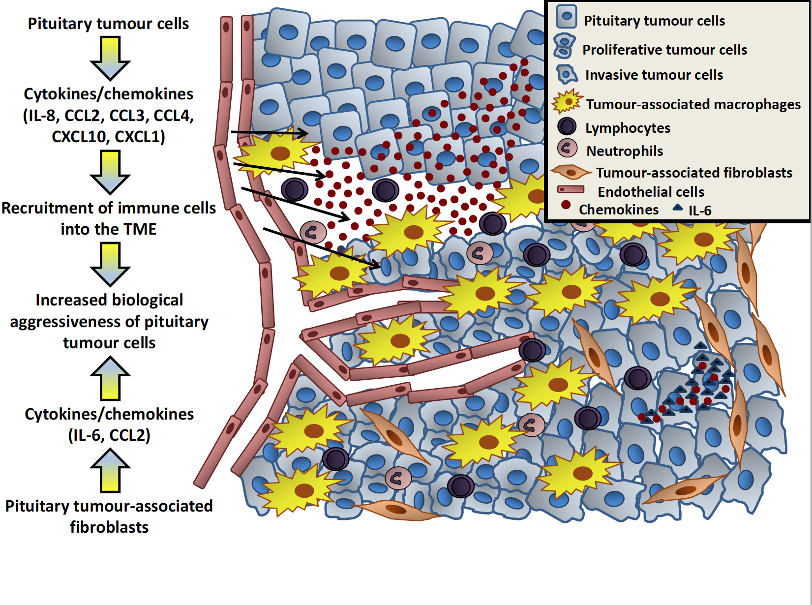 Pituitary tumour cells release different cytokines, particularly chemokines (including IL-8, CCL2, CCL3, CCL4, CXCL10, CXCL1), directly into the tumour microenvironment promoting the recruitment and infiltration of immune cells, including macrophages, lymphocytes and neutrophils. These infiltrating immune cells increase the growth of the tumour. Fibroblasts within the tumour are also able to secrete cytokines, such as IL-6, into the tumour microenvironment, which leads to increased invasion of pituitary tumour cells or the surrounding tissues.