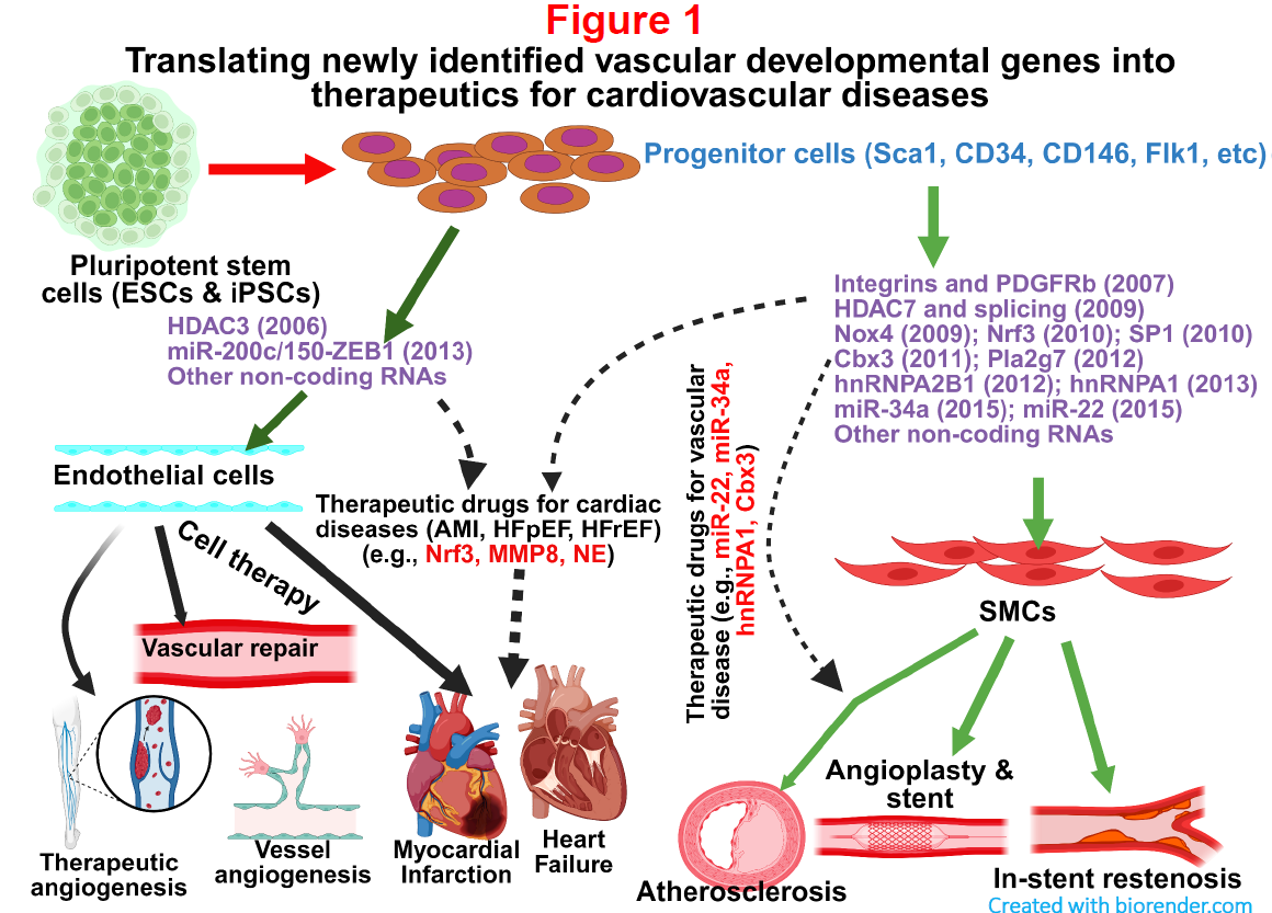 One of my main research interest is specifically focused on the study of identifying novel targets and signalling pathways such as microRNAs, transcription factors and other molecules which are crucial for vascular endothelial cell (EC) and smooth muscle cell (SMC) differentiation from murine/human pluripotent stem cells as well as adult stem/progenitor cells. By establishing simple but efficient vascular cell differentiation models, I was the first to report that matrix protein Collagen-IV, Nox4, Nrf3, Pla2g7, HDAC3, HDAC7, Cbx3, hnRNPA1, hnRNPA2B1, microRNA-34a, and miR-22 play a key regulatory role in vascular cell differentiation and vascular development (Figure 1). My goal is to continue exploring the key signal pathways underlying cardiovascular cell differentiation and cardiovascular development and their implications in cardiovascular diseases. Such findings will provide useful mechanistic insights into stem cell differentiation towards cardiovascular cells and will significantly enhance the knowledge of stem cell biology and cardiovascular biology in key areas of stem cell self-renewal, vasculogenesis, angiogenesis, and cardiovascular repair.