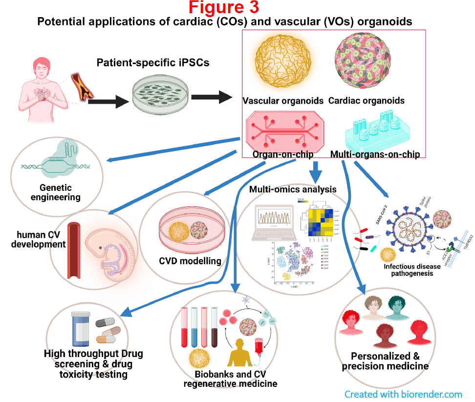 Traditional models including 2D cellular models and animal models have intrinsic and inherent limitations in fully capturing the intricacies of human tissue pathophysiology thereby reducing translational value and drug development potential. Recent advances has led to the development of cardiac and vascular organoids and heart/vessel-on-chip platforms. These novel stem cell based platforms can closely mimic the human cardiovascular system and pathophysiology, giving rise to high fidelity models that are superior to conventional models. Accordingly, my group seeks to develop novel cardiac and vascular organoids alongside heart/vessel-on-chip platforms from human iPSCs. Together with patient-specific iPSCs and gene editing tools, we hope to uncover disease aetiologies, investigate therapeutic interventions and conduct drug screening in a physiologically relevant context for the eventual goal of offering a personalized treatment for CVD (Figure 3).
