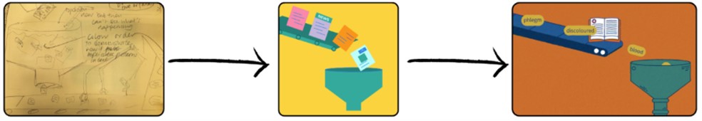 We knew we wanted to make animations, rather than videos, as we felt this was the best way to show complicated or technical information. This gave us the chance to explore lots of ideas about how to explain how LLMs work. We did not want to describe LLMs as ‘understanding’ language, and the group came up with the idea of it being like a factory, that processes text in a predictable way. In the image below you can see how the idea went from a sketch, to a basic drawing, to the final product: