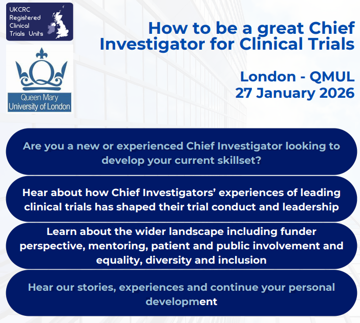 Registration is now open for our workshop, co-hosted by Barts CTU and PCTU, 'How to be a great Chief Investigator for Clinical Trials' on 27 January 2026.